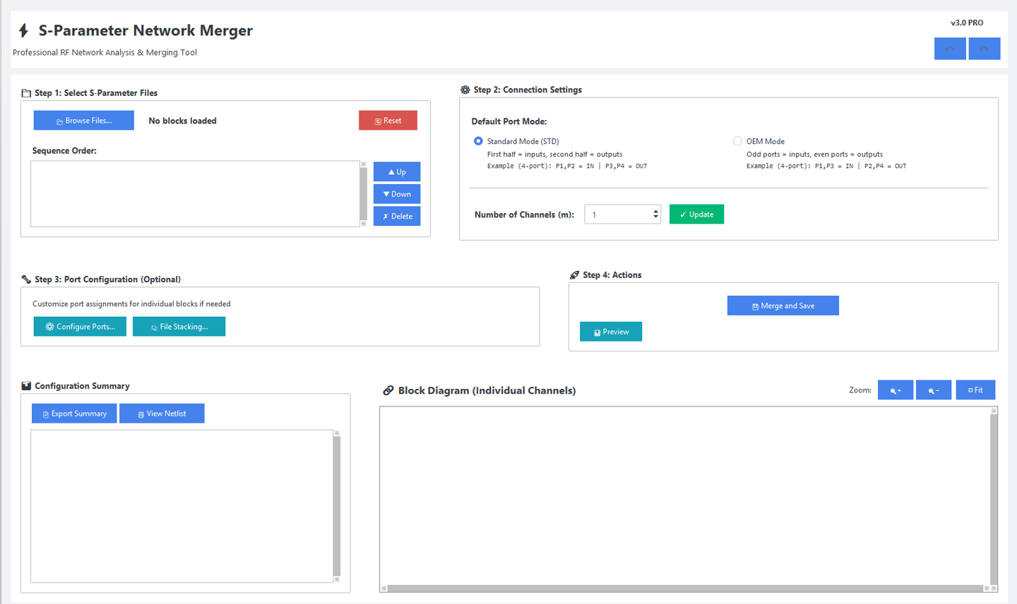 Use the file browser to load one or multiple S-parameter files. These files can be cascaded together or used to reduce the number of ports.