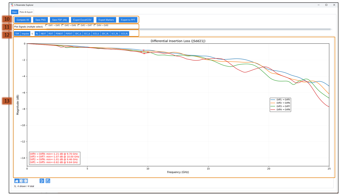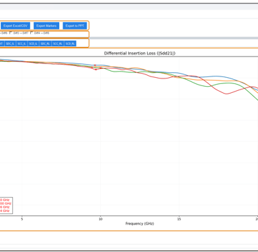 IL (Insertion Loss):Shows insertion loss for differential or single-ended signals based on port mapping. Reports the worst 10 IL values at the marker frequency.